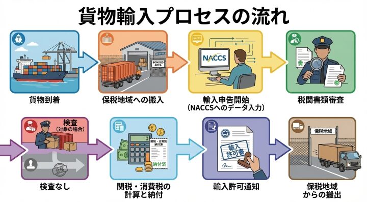 NACCSは輸入申告の中心ですが、全体の流れの中でどのタイミングで使うかを理解しておくとよりスムーズです。詳しくは全体像の記事で確認してください。